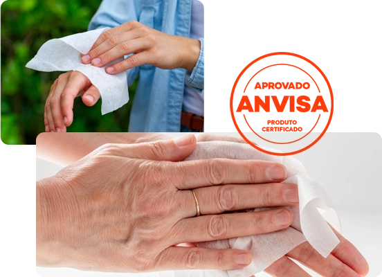 Lenços umedecidos com matérias-primas selecionadas, garantindo eficácia e segurança. Produção 100% automatizada, sem contato manual e regulamentada pela ANVISA.